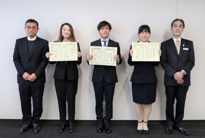 11月24日に行われた授与式には3名の新規奨学生が出席し、基金運営委員長である大阪大学大学院の潮俊光 教授、そして当社取締役常務執行役員 山添正道が奨学生に向けて激励の言葉を贈りました。続いて、新規奨学生が認定書を受け取り、さらなる学業への精進を誓いました。