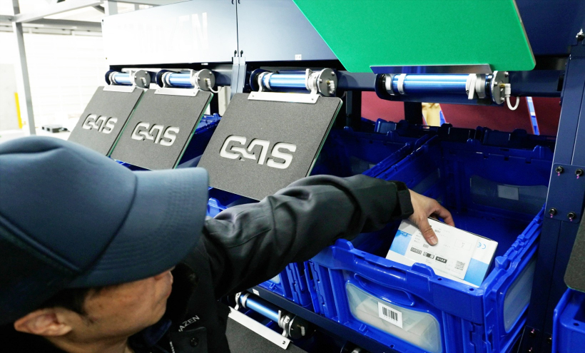 株式会社タクテックのGASを採用。仕分け作業をする各間口にゲートを設け、商品のバーコードをスキャンすると、該当する間口のゲートだけが開きます。