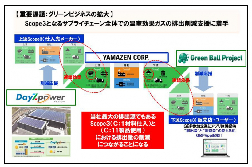 PPA事業によって仕入メーカーの再エネ調達を支援し、同時に当社の製品仕入排出量の圧縮をします。また、「グリーンボールプロジェクト」によって環境負荷の低い製品を販売することで、製品使用排出量の圧縮を進めます。つまり、流通商社としてサプライチェーン全体でのCO2の排出の抑制を目指しています。