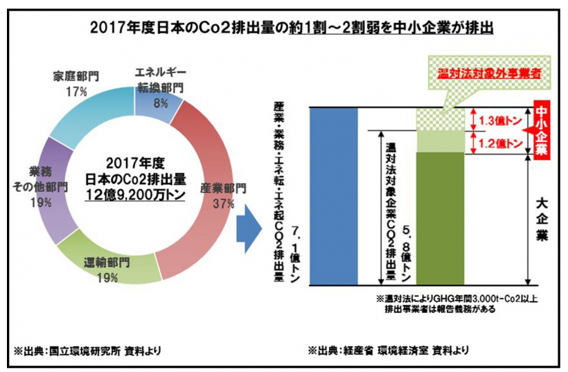 コロナ前、日本のCO2の総排出量は12 億9,000 万トンです(2017年度)。そのうち、産業分野等、企業排出は7.1億トンとされ、その中に含まれる中小企業の排出量はおよそ約2 割弱を占めるとされています。
