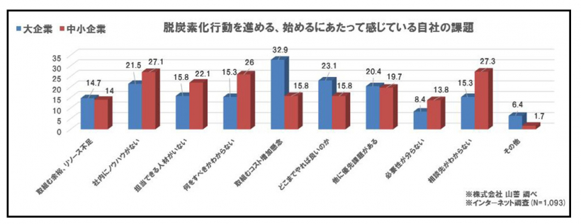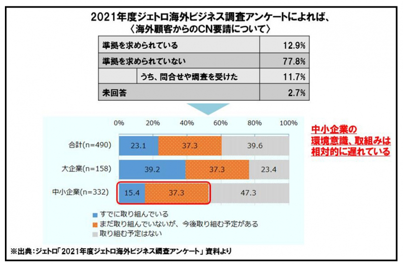 一方、ジェトロの調査からは、中小企業の脱炭素化への取り組みは大企業に対して、相対的に遅れているといえます。