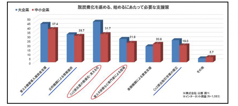 脱炭素化を進めるに当たっての支援策については、大企業・中小企業に関わらず、「公的補助金」や「公的機関の情報」を求める声が多いのと同時に、「CO2排出量の可視化」や「省エネ診断」を求める声も多くなっています。当社としては、この部分を中心に取引先企業に対してご支援できると考えています。