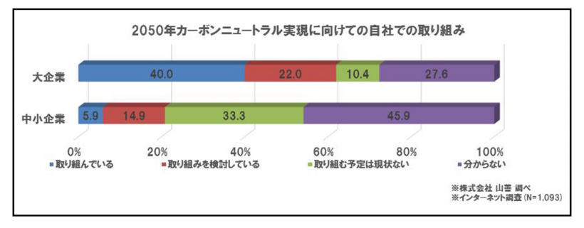 「カーボンニュートラルへの取り組み」は、中小企業のほうが、かなり遅れているという結果となりました。