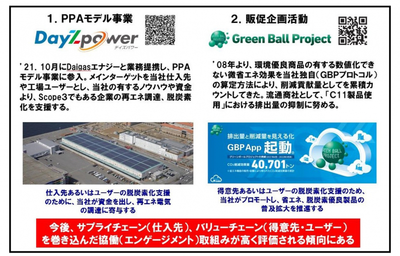 「開発ビジネス」において昨年から取り組んでいるのは、コーポレートPPA事業です。これは、当社が発電設備投資を負担し、再エネ電気を長期に渡り特定クライアントに売電するというものです。現在は、主に当社仕入先メーカー向けに展開しています。一方、「販促企画」としては、2008 年より展開している「グリーンボールプロジェクト」となります。主に中小企業の顧客に対して環境優良商品の販売を行っています。