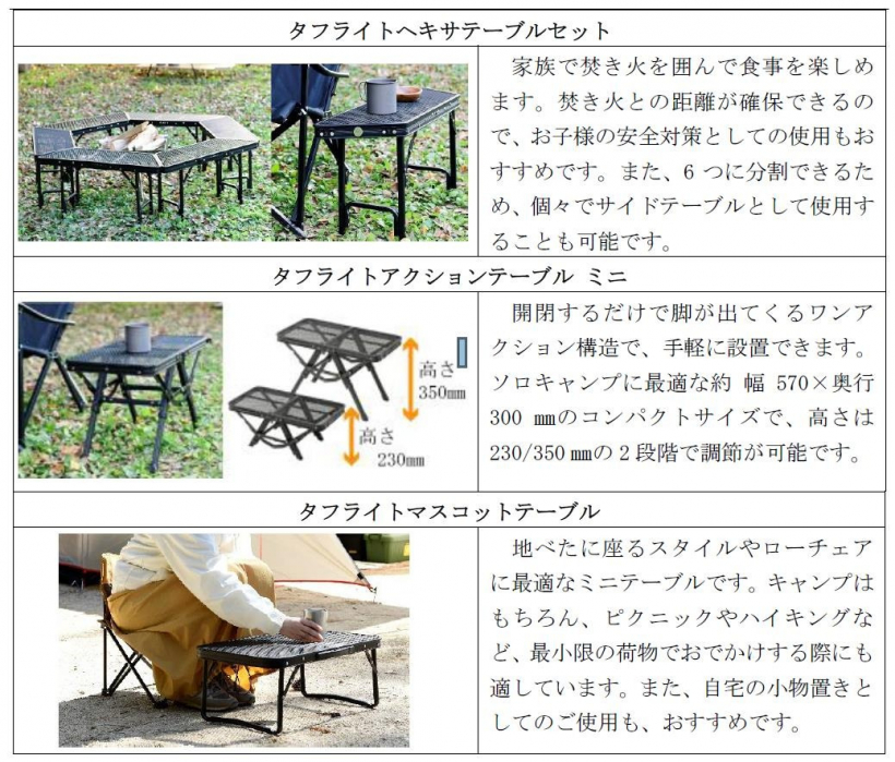今季は、ファミリーキャンプ向けの焚き火を囲んで楽しめる「タフライトヘキサテーブルセット」と、ソロキャンプ向けの「タフライトアクションテーブル ミニ」、「タフライトマスコットテーブル」の計3アイテムを新発売いたします。是非、ご自身のキャンプスタイルに合った「タフライトテーブル」シリーズを見つけて、こだわりのキャンプ料理や焚き火など、優雅なひと時をお過ごしください。