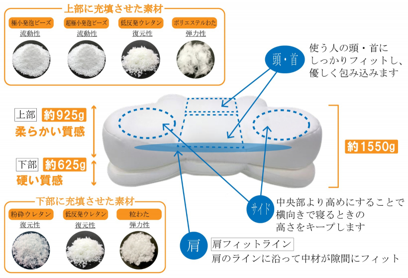 当社従来品の2.6倍となる約1,550gの素材(数種類の素材をブレンド)を上部に約925g、下部に約625g充填した2層構造で、厚みを出しつつ、頭・首・肩をしっかり支えるフィット感を実現しました。上部は、柔らかい質感とし、頭・首を優しく包み込みながらも沈みすぎを防ぎます。また、頭・首・両サイドと4つに区切ることで、中材が偏ることなく厚みを維持することができ、横向きで寝るときも高さをキープし、首をしっかりとホールドします。加えて、「肩フィットライン」を設けることで、肩のラインに沿って中材が隙間にフィットし、肩を支えます。一方で下部は、硬い質感とし、上部で包み込んだ頭・首をさらにしっかりと支えます。この2層構造により、どのような方でも頭・首・肩が絶妙にフィットし、一直線の綺麗な姿勢を維持します。