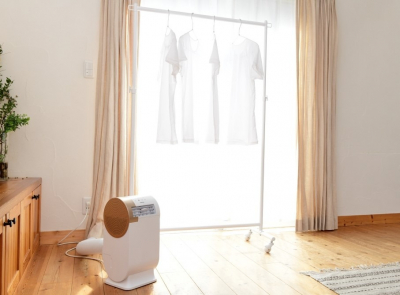 コンパクト設計ながら、周囲の温度に比べて-7℃(※2)の「冷風」、洗濯物の部屋干しにも使える「送風」、結露などの抑制対策にも使える「ドライ」の3つのモードを搭載しています。湿気の多いところで洗濯物を干す際などには、サーキュレーターとともに「ドライ」モードを使用することで、乾かす時間をさらに短縮させ、節電にも繋がります。