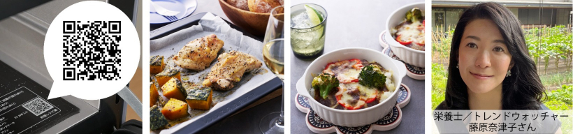 必要なときにスマートフォンで手軽にレシピブックが見られるよう、商品本体に二次元コードを設置しました。鶏肉のグリルやドリア、ガトーショコラなどの『タイパ』に優れたレシピを29品ご覧いただけます。加えて、栄養士/トレンドウォッチャー 藤原奈津子さん監修のスペシャルレシピ5選も、コメント付きでご紹介します。ぜひ、ご覧ください。
