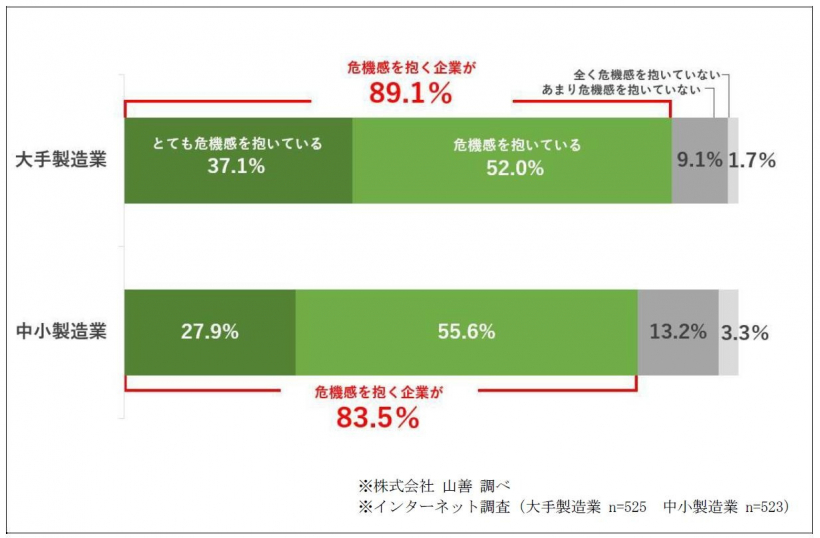 「とても危機感を抱いている」「危機感を抱いている」と回答した方は、大手製造業・中小製造業ともに8割を超える結果となり、現状に危機感を強めていることが分かります。