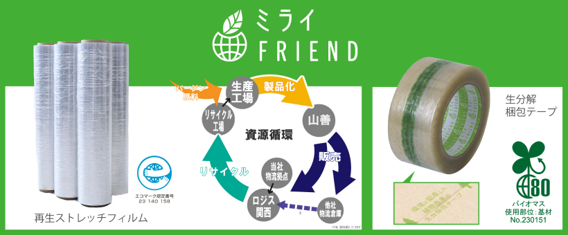 株式会社山善(本社:大阪市西区/代表取締役社長:岸田貢司 以下、当社)は、環境配慮商品の新ブランド『ミライFRIEND(フレンド)』を立ち上げました。ブランド第一弾となる「再生ストレッチフィルム」を2024年5月上旬より、第二弾「生分解梱包テープ」を2024年5月中旬より、当社が運営するインターネット通販サイト「山善ビズコム」やECモールの「くらしのeショップ」などで順次発売いたします。