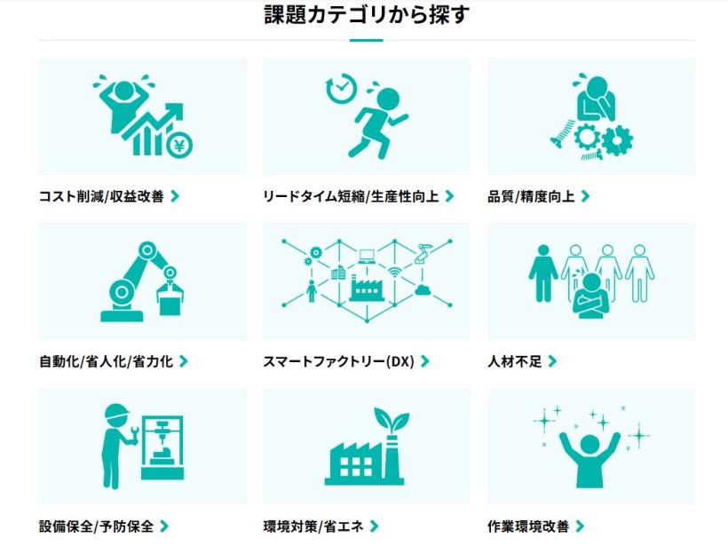 具体的には、コスト削減、リードタイム短縮、自動化、スマートファクトリー(DX)、環境対策などの課題別にコラムや業界トピック、新商品紹介をキュレーションし、さらに展示会・セミナー、導入事例、補助金情報など、製造業の皆様にとって有益な情報を随時更新してまいります。これにより、課題解決のヒントや未来に向けた取り組みの一助になればと考えています。