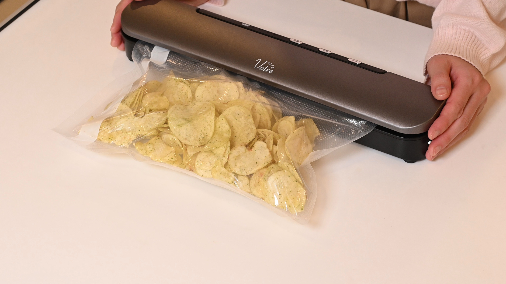 専用保存袋以外の袋も密封することができます。一度開封したお菓子の袋を再度密封し、お菓子の美味しさを保ちます。また、食品に合わせ、「脱気して密封(真空パック)※3」「脱気の途中で密封」「脱気しないで密封」の3通りの密封方法が可能です。