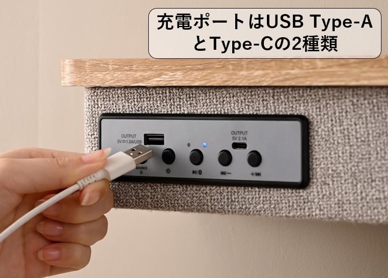スピーカーは、Bluetooth®やUSBメモリ再生に対応。充電ポートはUSB Type-AとType-Cの2種類を備え、スマートフォンなどを充電しながらスピーカーとしても利用でき、臨場感のある音楽を手軽に堪能できます。天板下部にはライトも搭載。間接照明のように柔らかい光が特徴的で、ベッドサイドに設置すれば、就寝前のリラックスタイムに落ち着いた雰囲気と音楽を同時に楽しむことができます。