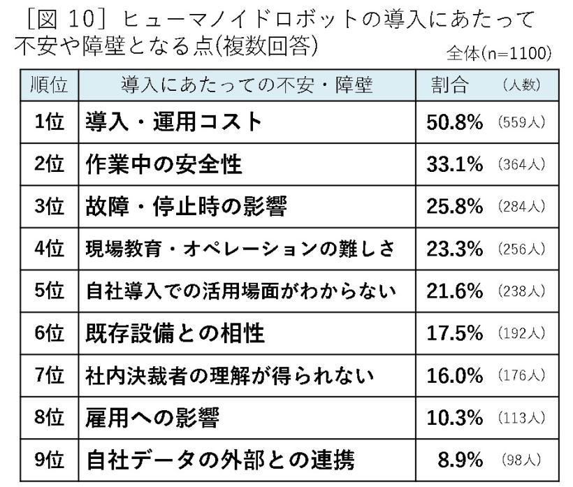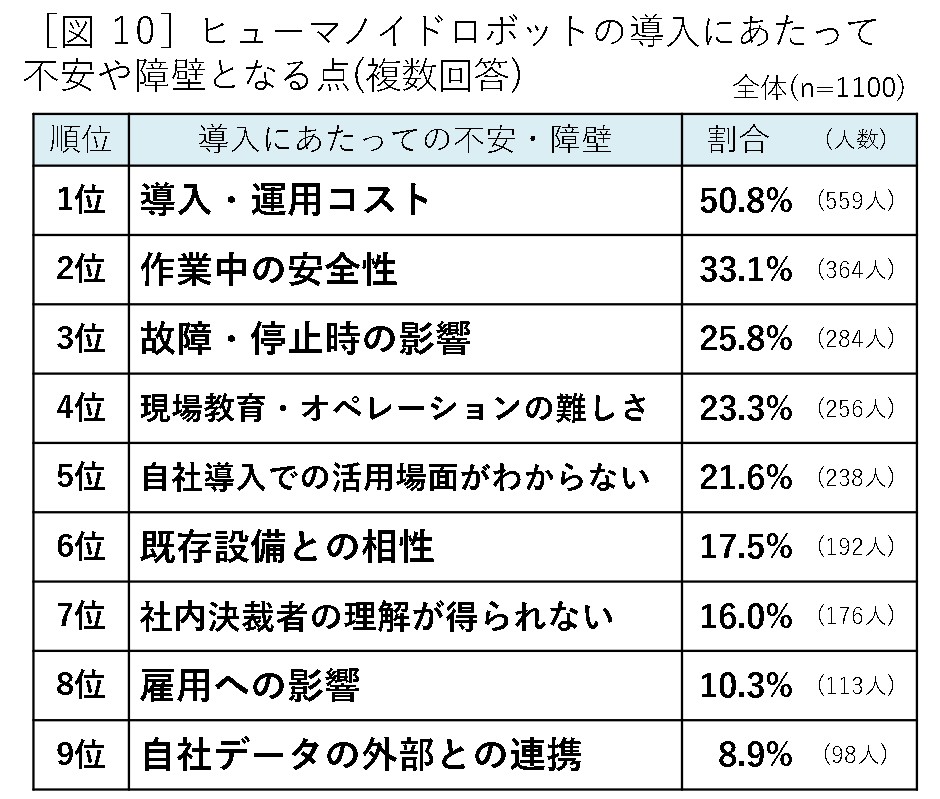 導入にあたり不安な点や障壁を聞くと、トップ3は「導入・運用コスト」(50.8%)、「作業中の安全性」(33.1%)、「故障・停止時の影響」(25.8%)となりました[図 10] 。