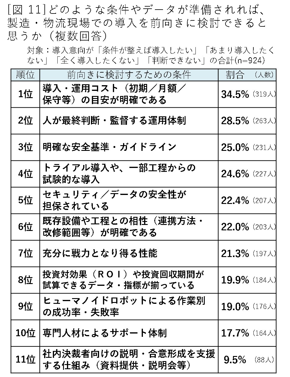 ・製造や物流の現場におけるヒューマノイドロボット導入を前向きに検討できるようになるための条件では「導入・運用コストの目安が明確である」(34.5%)の他、「人が最終判断・監督する運用体制」(28.5%)、「明確な安全基準・ガイドライン」(25.0%)が上位に。