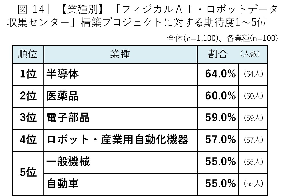 業種別では「半導体」(64.0%)、「医薬品」(60.0%)、「電子部品」(59.0%) 、「ロボット・産業用自動化機器」(57.0%)が期待度の高いトップ4業種となり、特に高精度の技術や厳格な品質管理が求められる業種が並びました。「フィジカルAI・ロボットデータ収集センター」によるデータ収集が、ヒューマノイドロボット実装の加速要因となる可能性が示唆される結果となりました [図 14] 。