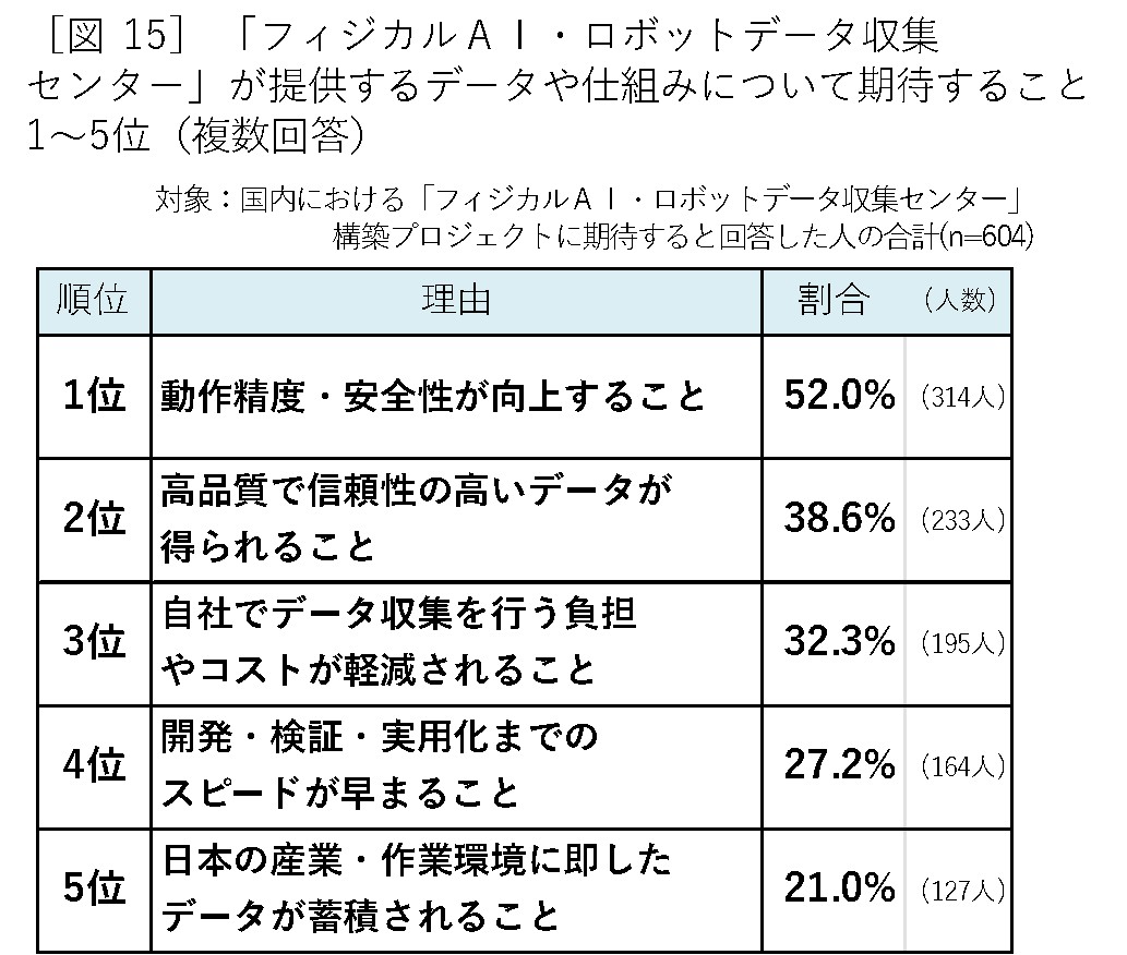 「フィジカルAI・ロボットデータ収集センター」が提供するデータや仕組みへの期待としては、「動作精度・安全性が向上すること」(52.0%)が1位となり、実用レベルでの高い信頼性が求められていることがわかりました。続く「高品質で信頼性の高いデータが得られること」(38.6%)は約4割で、質の高さを価値と捉える声が多く上がりました。また「自社でデータ収集を行う負担やコストが軽減されること」(32.3%)も3割以上となり、共同基盤としてのセンター活用への期待が感じられます [図 15]