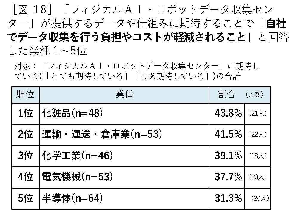 「自社でデータ収集を行う負担やコストが軽減されること」への期待度では、「化粧品」(43.8%)、「運輸・運送・倉庫業」(41.5%)、「化学工業」(39.1%)がトップ3となりました。いずれも品質の安定、稼働の確実性、安全性の確保が重視される業種です。本項目では、「フィジカルAI・ロボットデータ収集センター」を共同基盤として活用できる強みとして、コスト面にとどまらず、成長を加速させながらも安全性を高めるなど、幅広い効果につながる点が評価されていると考えられます[図 18]。