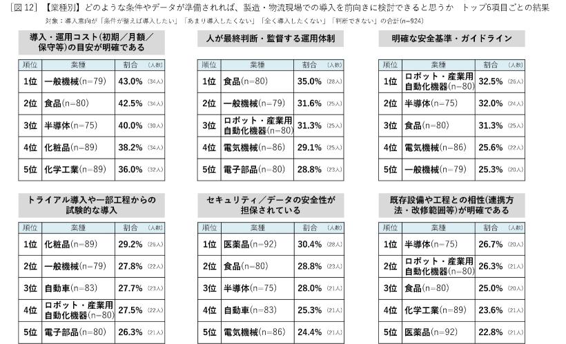 「どのような条件やデータが準備されれば、製造・物流現場での導入を前向きに検討できると思うか」の回答トップ6項目について、それぞれの上位となった業種の傾向を分析しました[図 12]。