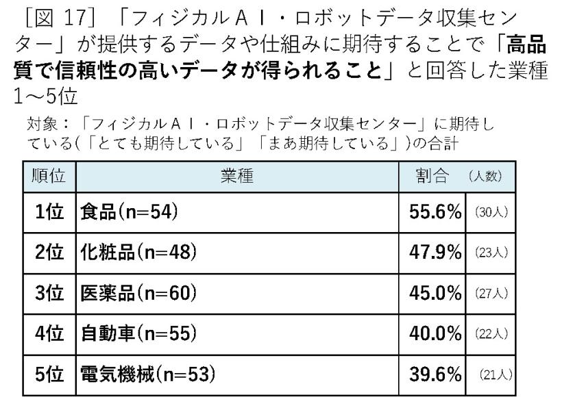・「食品」は「フィジカルAI・ロボットデータ収集センター」が提供するデータや仕組みにより「動作精度・安全性が向上すること」「高品質で信頼性の高いデータが得られること」の両方で最も高い期待度を示す。