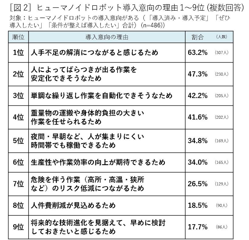 導入意向の理由は、1位の「人手不足の解消につながると感じるため」が63.2%と抜きんでて高く、現状の課題や将来の不安要素が浮き彫りに。2位の「人によってばらつきが出る作業を安定化できそうなため」(47.3%)も約5割が回答しています。