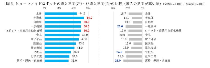 ものづくり産業11業種全てで、ヒューマノイドロボット導入意向率が非導入意向率を上回る