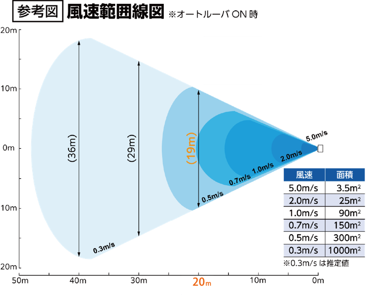 ※周囲温度29℃/湿度50%、風量ボリューム最大、最大冷却時の吹出空気である21℃/湿度78%及び吹出口直近最大風量10m/sを元にミスナール計算式にて算出した値