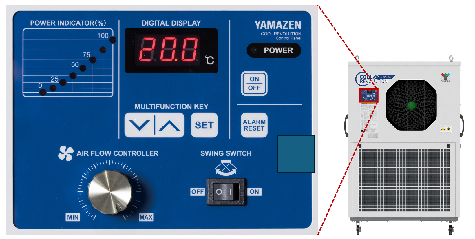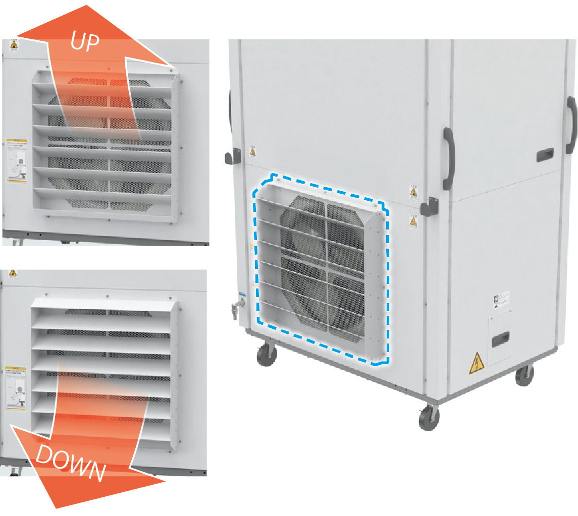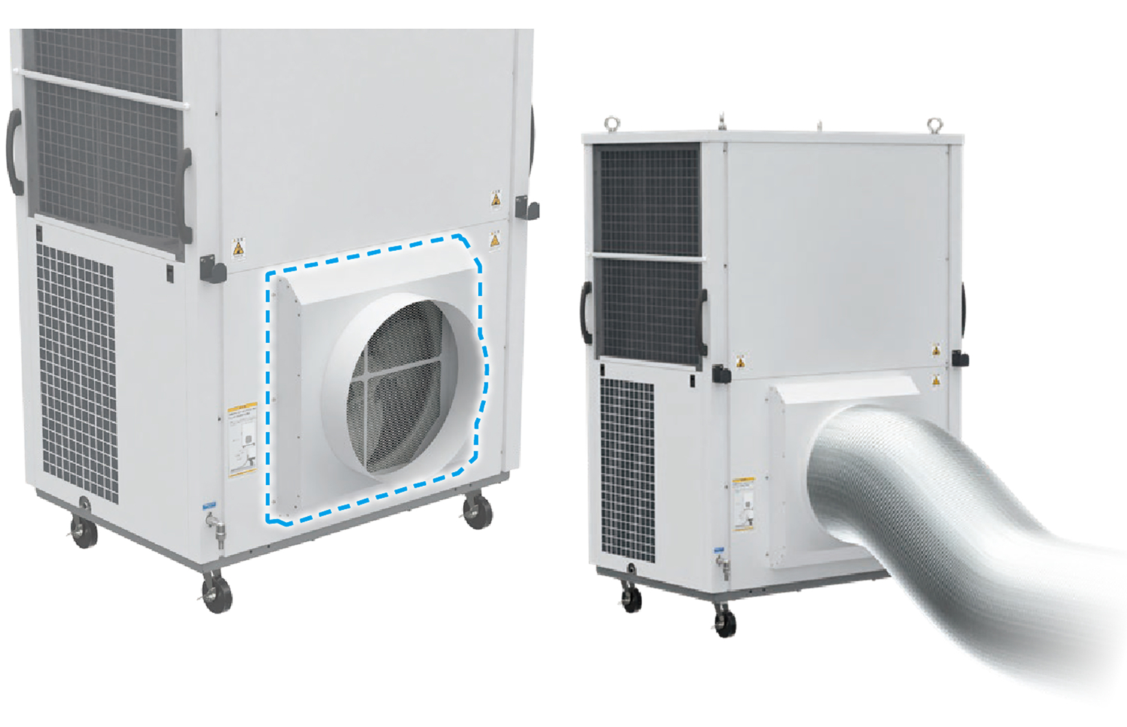 「クールレボリューション」は、大掛かりな設置工事が不要で、電源コードを繋いですぐ使用でき、キャスター付きで柔軟な配置変更が可能です。また、広範囲を1台でカバーするオートルーバーを標準装備しているほか、コントロールパネルの配置を変更するなど、機能性、操作性も向上しました。さらに、別売のダクトを装着すれば、コンテナ荷降ろし時の「コンテナ内冷却」のように、設置場所が確保しにくいシチュエーションでも、必要な箇所だけを狙うピンポイント冷却に柔軟に対応します。あわせて、排熱を適切に処理し、冷却効率を高める別売オプションもラインアップしています。