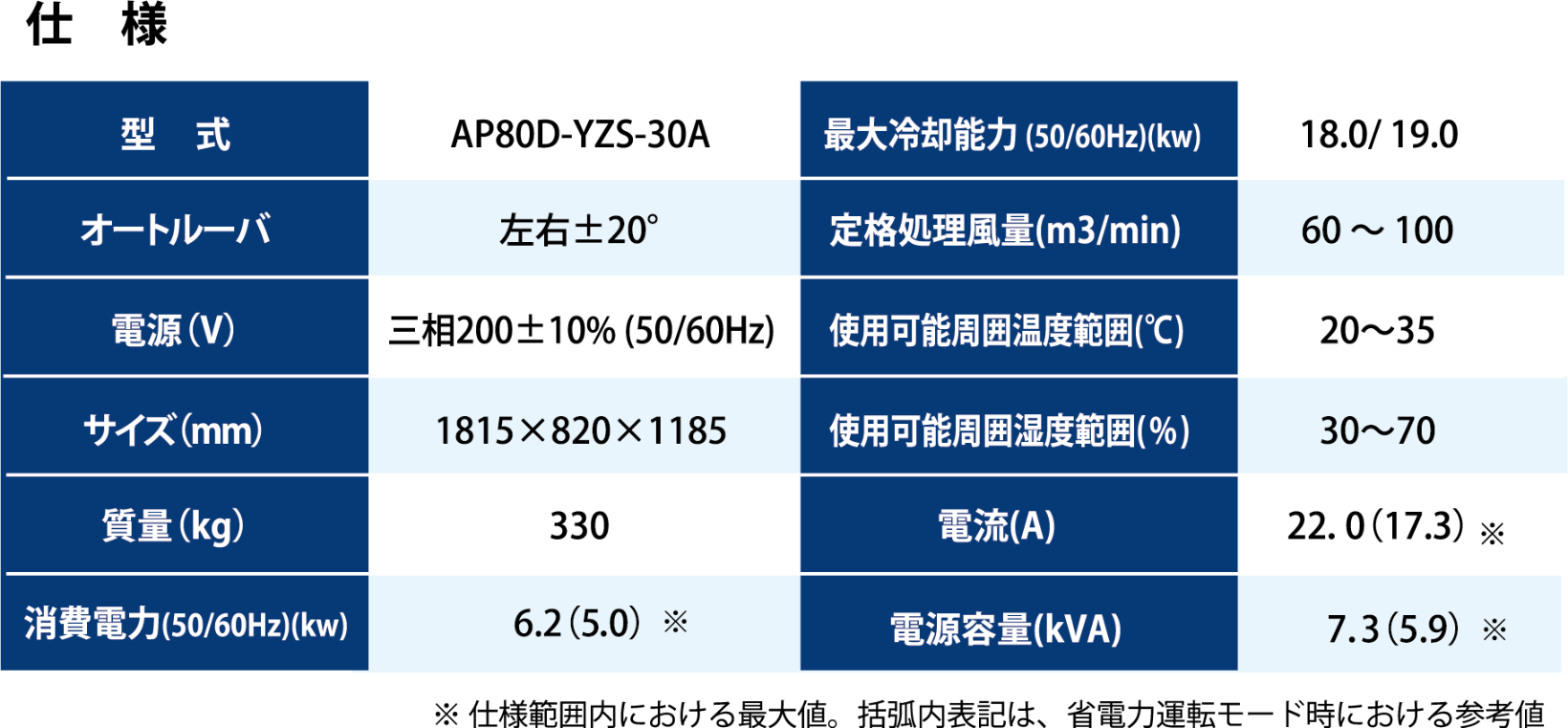 冷媒R32の採用により、定格処理風量は最大100㎥/min、吹出口付近では体感温度11℃※の冷風を送風します。さらにオートルーバーを使用することで、広範囲に冷風を届けます。