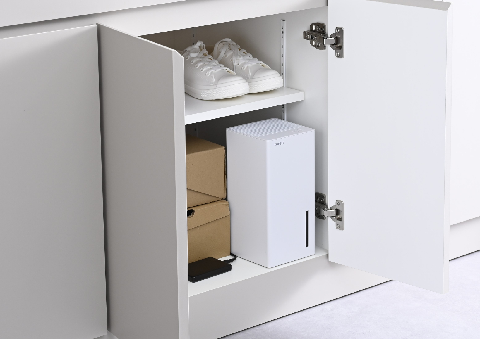 幅を抑えたスリムなコンパクト設計で、下駄箱やクローゼットなどの限られたスペースにも設置が可能。気になる空間をピンポイントで湿気対策できるほか、PD36W以上の出力に対応したモバイルバッテリーにも対応し、電源の取りにくい場所でも使用できるなど、高い設置自由度を実現しました。