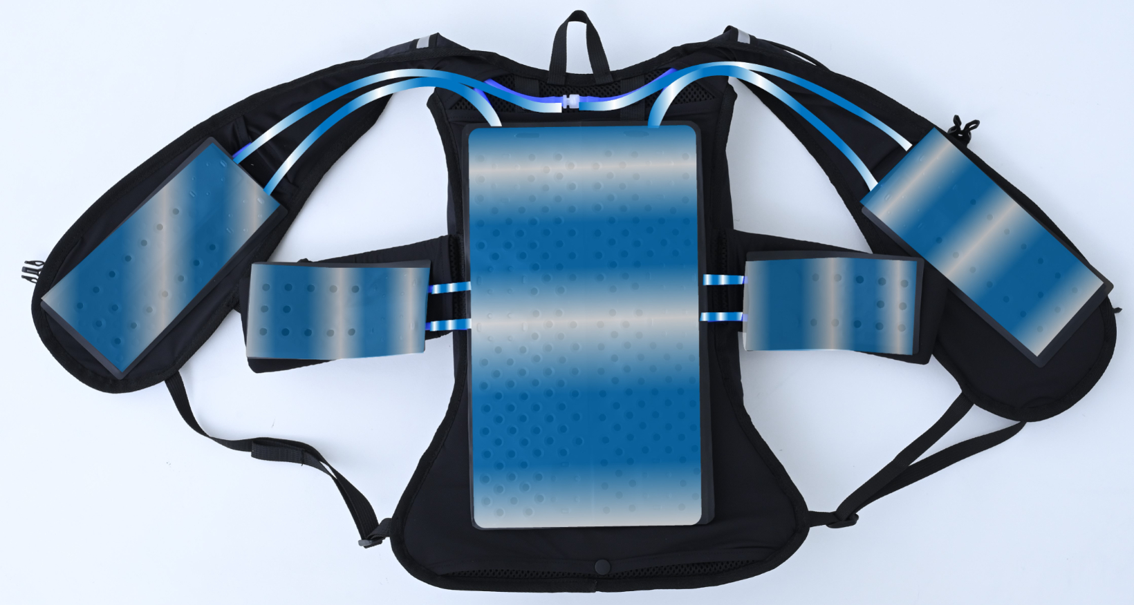 従来モデルはチューブ内を流れる水によって身体を冷却していましたが、本モデルでは背中を面で冷却する水路式構造を採用しました。