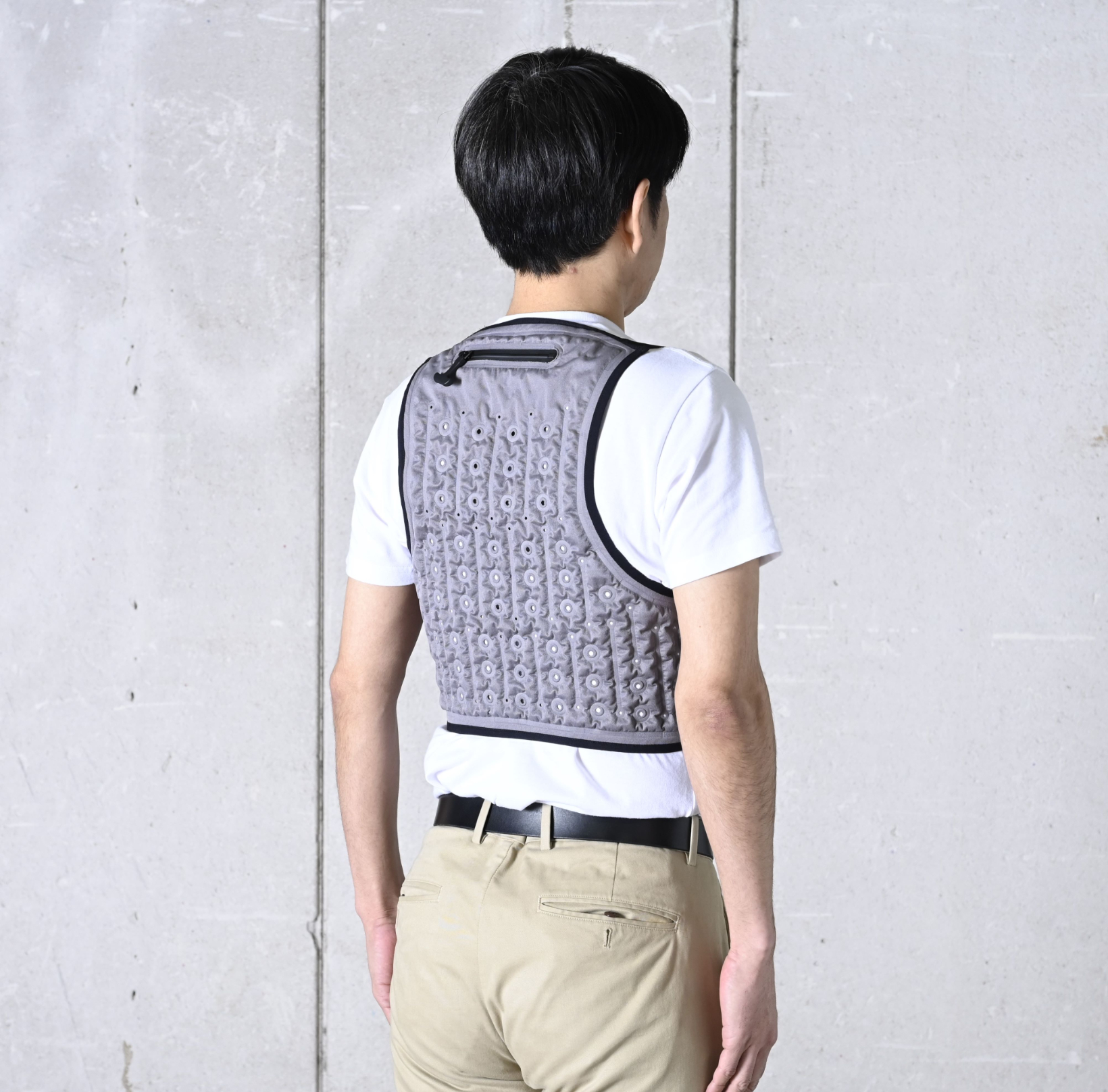 背中の広い面積を効率よく冷却できる一方、冷却部には通気用の穴あき構造を設けることで通気性も確保。水路の表面を吸水性の高い布で覆い、面でしっかり冷やしながらもムレにくく、長時間の作業でも快適に着用できます。