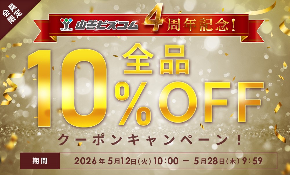 株式会社山善(本社:大阪市西区、代表取締役社長:岸田貢司)のオフィス・店舗向けのECサイト「山善ビズコム」は、2026年5月10日で開業4周年を迎えます。そこで、オープン4周年記念として、日頃のご愛顧への感謝の気持ちを込めて、「全商品10%オフクーポンキャンペーン」を5月12日(火)午前10時から実施いたします。