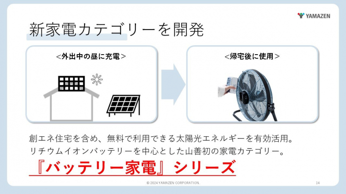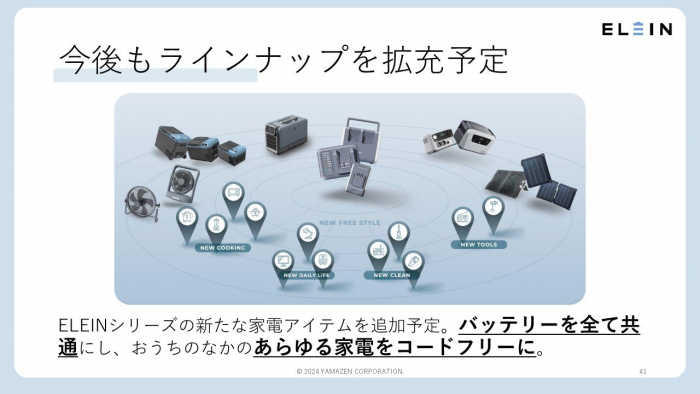 2024年5月15日、山善は共通のリチウムイオンバッテリーで動く家電シリーズ「ELEIN(エレイン)」を発表した。「ELEIN」は、リチウムイオンバッテリーと太陽光エネルギー活用を組み合わせた新たなシリーズ。6月上旬以降、第1弾として扇風機やスポットクーラーといった家電や、ポータブル電源、ソーラーパネルなど計16アイテムを順次発売する。