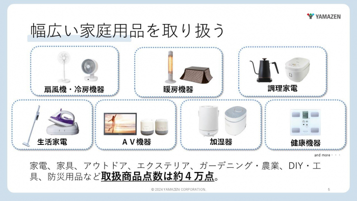 山善は、工場内で使われる機械や工具を扱う生産財と、住宅設備機器、建材、家具や家電などを扱う消費財の専門商社。1947年の創業時より「革新と創造」をキーワードに挑戦を続けており、1978年家庭機器事業部が誕生。工具部門の販売ルート拡大のため、ホームセンターに電動工具等の販売を開始した。2024年時点では、扇風機や暖房機器、生活家電、健康機器、アウトドア用品など約4万点の商品を取り扱っている。