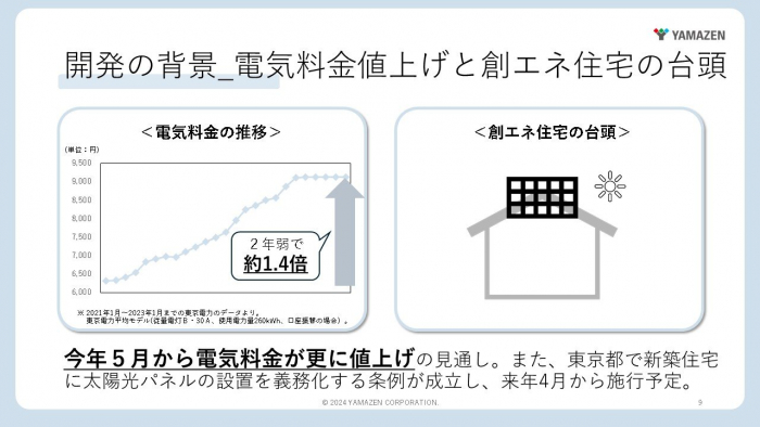 電気料金はここ2年弱で、約1.4倍に上がっている。さらに2024年6月より、国内の大手電力会社10社で電気料金の大幅の値上げが見通されている。また、世界全体が脱炭素に取り組む中、太陽光パネルを設置した創エネ住宅も増加傾向にある。東京都では、新築住宅に太陽光パネルの設置を義務化する条例が成立した(2025年4月から施行予定)。