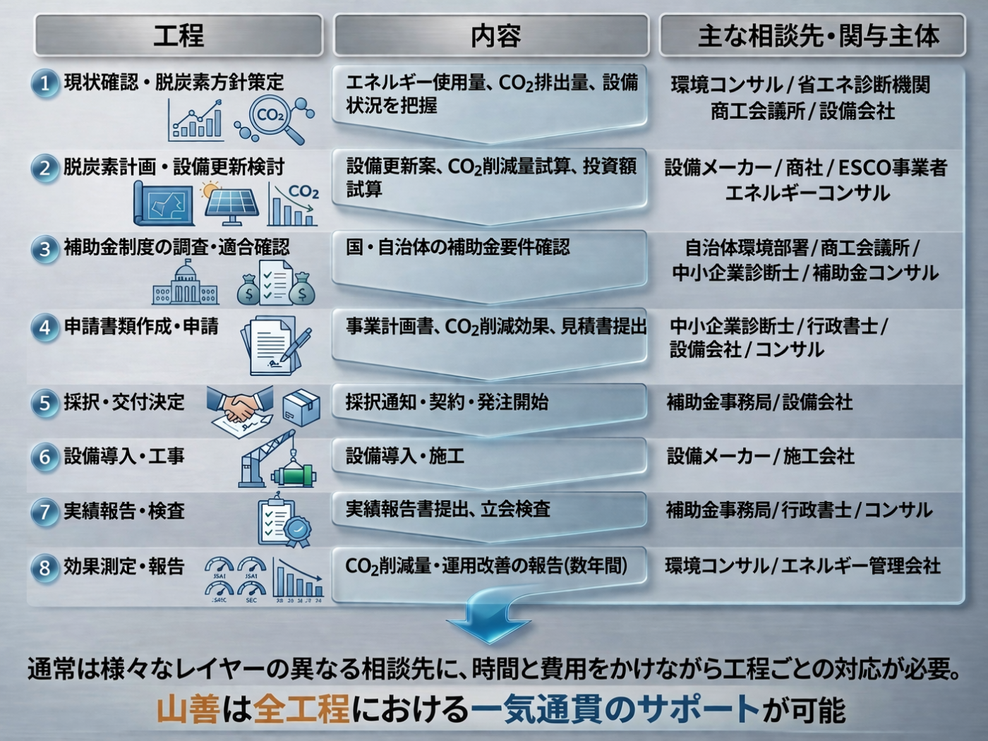 補助金と一言で言っても、世の中には数えきれないほどの補助金制度があり、その中から自社に合ったものを選択することすら容易ではありません。さらに、補助金の種類によって異なる必要書類の準備、事業計画書の作成や採択後の事務手続きなど、どの工程もかなりの労力が必要となり、企業のご担当者にとって面倒なことが山積みです。そんなご担当者の面倒をすべて請け負える“一気通貫”の体制が「ビジネスサポート室」の強みです。世の中には補助金申請のサポートを専門に行うコンサル系の会社もありますが、彼らが行うのはアドバイスと補助金の申請まで。ですが、もともと省エネ設備の販売も行なっている山善の「ビジネスサポート室」にご相談いただけば、初回のご提案から具体的に補助金を活用すればどのような設備が設置できて、電気代やCO2が実際にどのくらい減らせるかをお伝えできます。設備販売という既存ビジネスの営業力の強化として補助金申請がある、という位置付けですね。