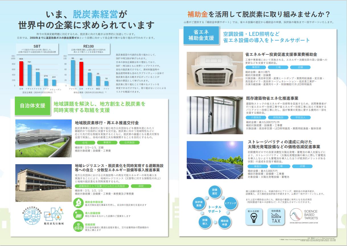温室効果ガスの排出実質ゼロをめざす2050年に向け、SBTやRE100といった国際的な枠組みへの意識は高まり、今後の日本ではさらに脱炭素に関わる補助金制度が増えてくると思います。脱炭素は義務ではなく経営戦略のひとつだと捉えていただき、知る人だけが得をする補助金制度と、山善の「ビジネスサポート室」をぜひ味方につけていただきたい。また、自治体の皆様と課題を解決しながら、地域企業の方々と脱炭素に取り組み、ともに、地域の発展に貢献していけたらと思っています。