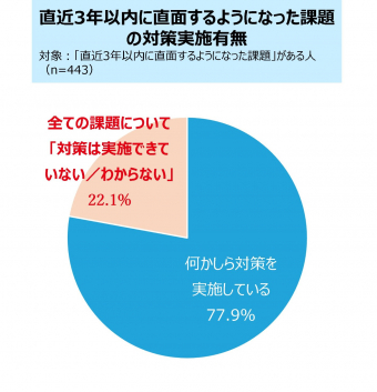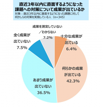 直近3年以内に直面するようになった課題に対して何かしらの対策を実施している人に、成果が出ているかどうかを聞いたところ、4割以上の企業が「成果が出ていない」(「あまり成果が出ていない」「全く成果が出ていない」の計)と回答しました。対策を実施していても、半数近くの企業が成果を得ることができていないという厳しい現状がうかがえます。
