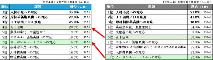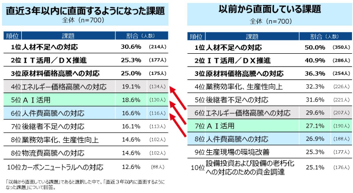 直近で、「AI活用」「カーボンニュートラルへの対応」の課題がランクイン。