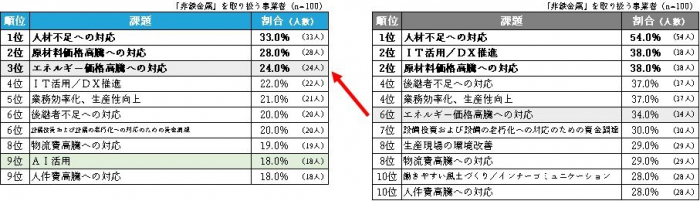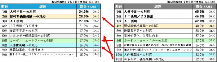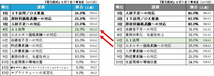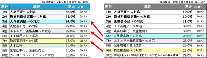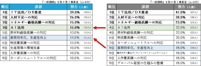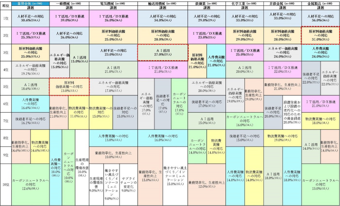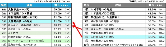 また、『輸送用機械』では「AI活用」、『鉄鋼業』と『金属製品』では「人件費高騰への対応」が3位にランクインしています。