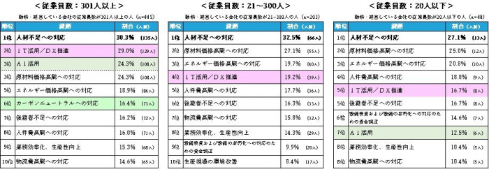 直近3年以内に直面するようになった課題の上位10項目を企業規模別で比較すると、「人材不足への対応」および「原材料価格高騰への対応」は共通して上位に入っている一方で、「カーボンニュートラルへの対応」や「IT活用/DX推進」「AI活用」は、従業員数が多い企業ほど上位にランクインしています。