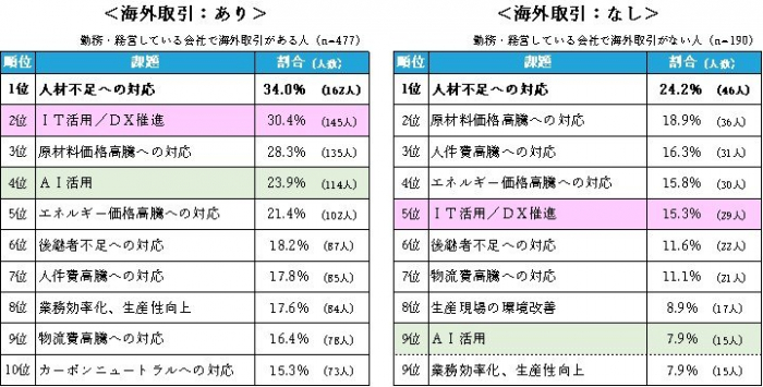直近3年以内に直面するようになった課題を、海外取引の有無で比較すると、海外取引がある企業では「IT活用/DX推進」や「AI活用」が上位に挙がっています。グローバル水準に合わせるためには、DX化への対応が必須といえます。