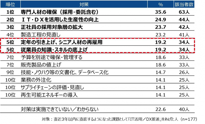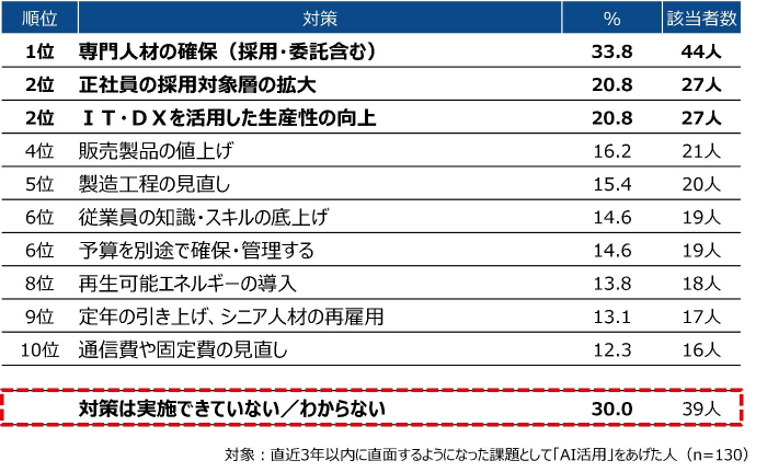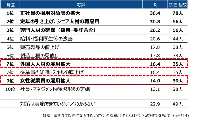 実施している対策としては「正社員の採用対象層の拡大」がトップ。これまでは臨時で派遣社員などを雇用していましたが、企業の成長には優秀かつ辞めない人材を確保することが必要です。そのための正社員採枠を広げようという傾向が見られます。